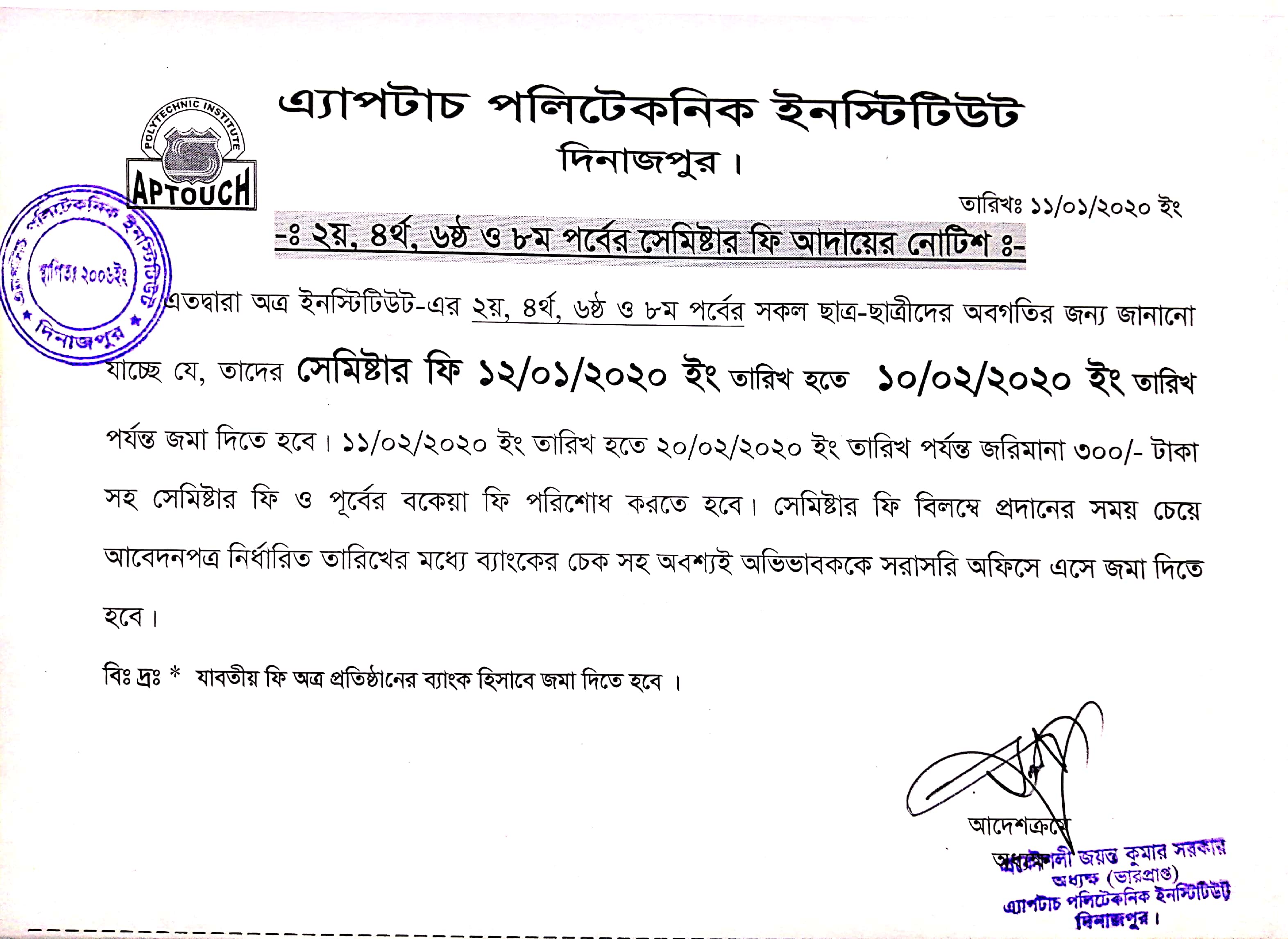 এতদ্বারা অত্র ইনস্টিটিউট-এর ২য়, ৪র্থ, ৬ষ্ঠ ও ৮ম পর্বের সকল ছাত্র-ছাত্রীদের অবগতির জন্য জানানো যাচ্ছে যে, তাদের সেমিষ্টার ফি ১২/০১/২০২০ ইং তারিখ হতে ১০/০২/২০২০ ইং তারিখ পর্যন্ত জমা দিতে হবে। ১১/০২/২০২০ ইং তারিখ হতে ২০/০২/২০২০ ইং তারিখ পর্যন্ত জরিমানা ৩০০/- টাকা সহ সেমিষ্টার ফি ও পূর্বের বকেয়া ফি পরিশোধ করতে হবে। সেমিষ্টার ফি বিলম্বে প্রদানের সময় চেয়ে আবেদনপত্র নির্ধারিত তারিখের মধ্যে ব্যাংকের চেক সহ অবশ্যই অভিভাবককে সরাসরি অফিসে এসে জমা দিতে হবে।