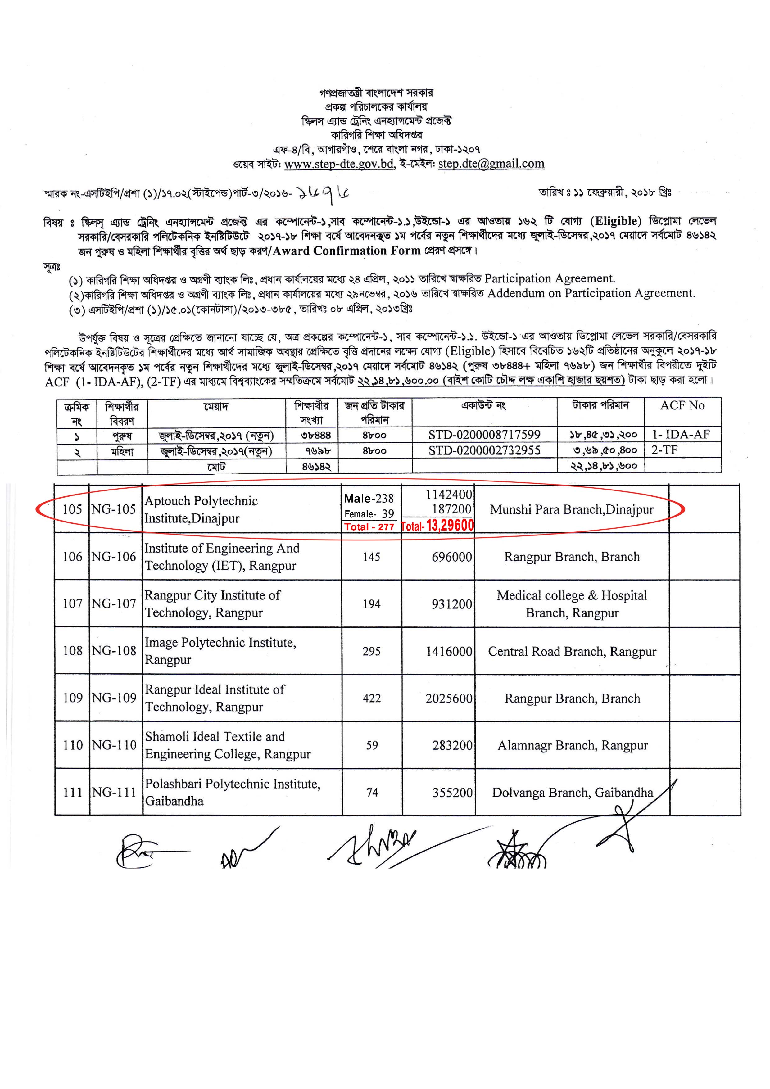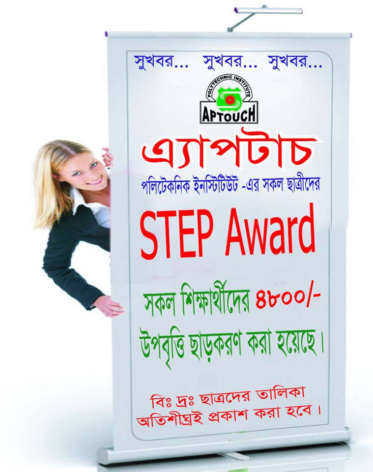 এ্যাপটাচের ২০১৭-১৮ শিক্ষাবর্ষের সকল নতুন (২য় পর্বে অধ্যয়নরত) ছাত্র/ছাত্রীদের জানানো যাচ্ছে যে, বিশ্ব ব্যাংকের আ্ওতায় STEP এর বৃত্তির জন্য অত্র ইনস্টিটিউটের 277 জন ছাত্র/ছাত্রী নির্বাচিত হয়েছে । নির্বাচিত ছাত্র/ছাত্রীরা বিশ্ব ব্যাংকের আওতায় Step এর বৃত্তি জুলাই-ডিসেম্বর ২০১৭ মেয়াদে ছয় মাসে মোট ৪৮০০ টাকা করে উপবৃত্তি পাবে।